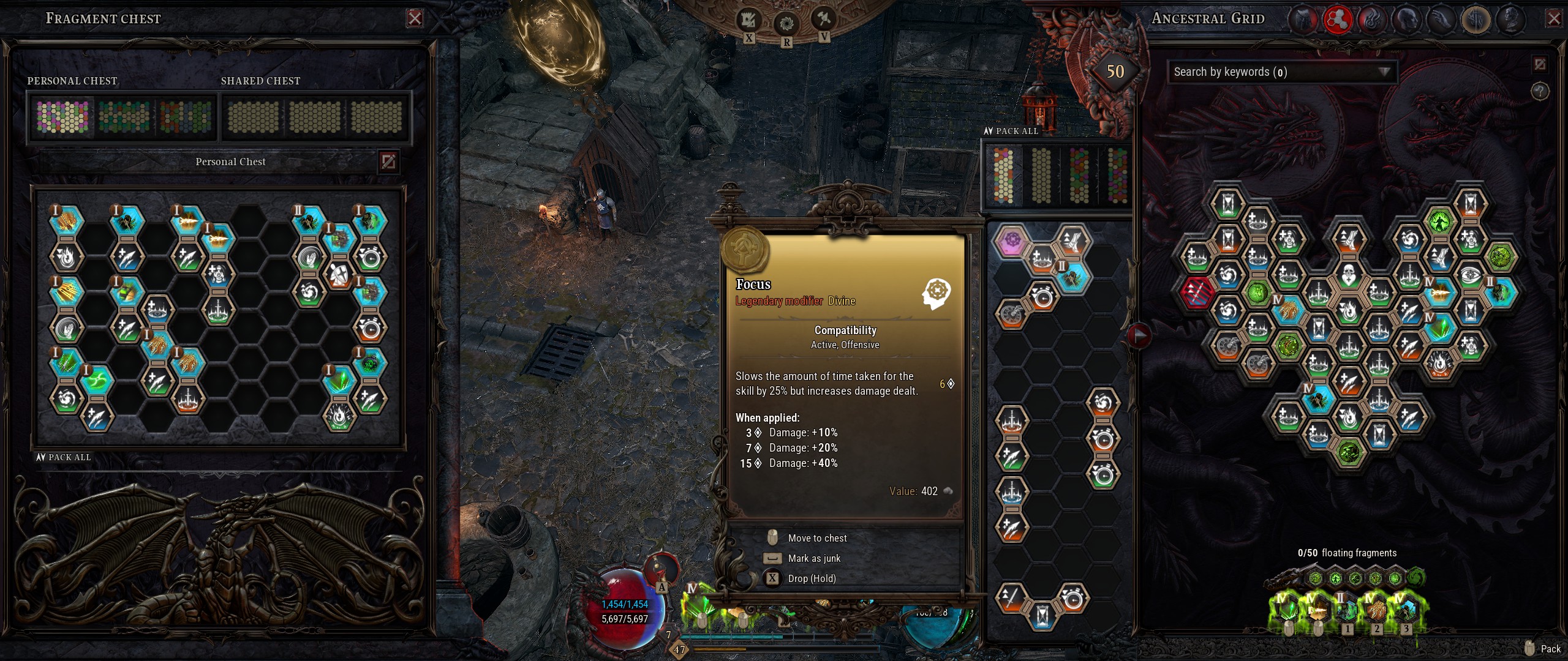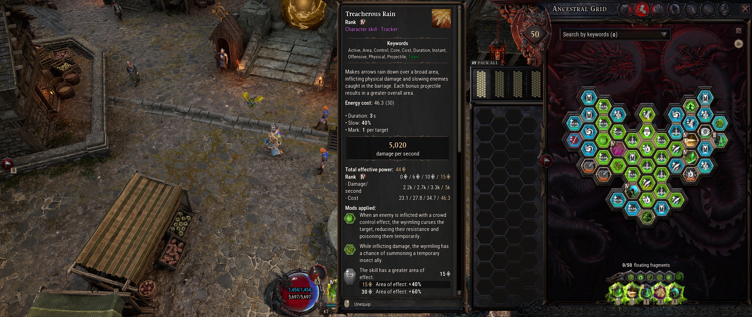 À ce stade, je me dois de préciser que les compétences de classes sont des compétences actives, assignées à des touches pour leur utilisation. Mais les compétences de Wyrmlings sont des compétences réactives. Chacune de ces compétences doit être associée à une ou plusieurs compétences de classe compatible (elles peuvent ne fonctionner qu'avec des compétences basiques, canalisées, utilitaires, etc) en ayant leurs fragments en contact dans la grille. Ensuite, lorsqu'on utilise une compétence de classe, les compétences de Wyrmling associées peuvent se déclencher si la condition est remplie : activation de la compétence ou dégâts avec la compétence par exemple, avec parfois une restriction - chance d'activation, temps de récupération, etc. Les modificateurs apportent des effets basiques et ce sont les compétences de Wymrling qui apportent réellement ce petit truc en plus aux combats.