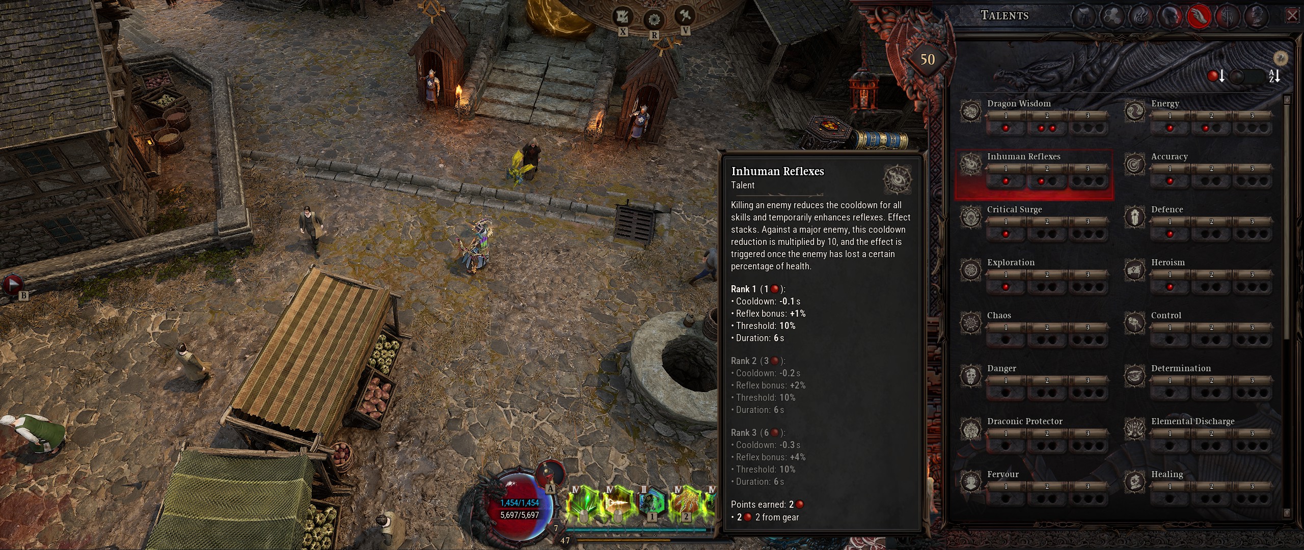 Signalons que les modificateurs ainsi que les équipement ont différents niveau de qualité et peuvent avoir cet attribut "Divin". Ce n'est pas le cas des compétences qui sont uniques. Les plus attentifs auront noté que j'ai parlé plus tôt d'améliorer les compétences de classe (et uniquement les compétences de classe). En effet, ces dernières observent le total de puissance effective (la puissance nécessaire pour débloquer les différents paliers des effets, le surplus étant ignoré) pour monter en rang à certains paliers (6, 10 et 15). Chaque rang augmente les dégâts de la compétence, mais augmente également son coût. Et, au rang 4, elle entre en Symbiose, adoptant en plus l'élément du Wyrmling équipé.