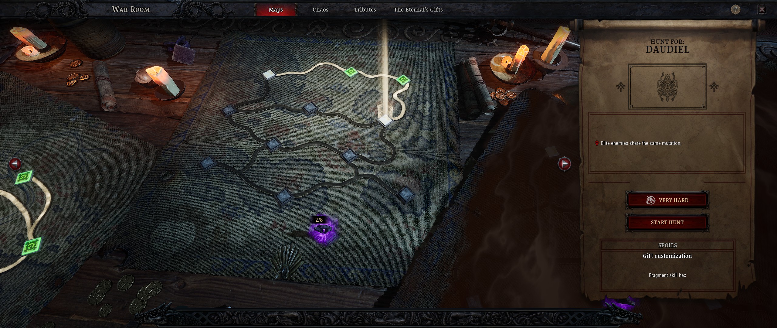 Une fois l'aventure terminée (qui désormais amène jusqu'au niveau max, largement si en plus on augmente la difficulté) de nouvelles activités s'ouvrent à nous. La première est un système de Cartes, nous envoyant chaque fois à un endroit différent du monde tuer quelques ennemis, réaliser quelques objectifs ou tuer un boss, le tout avec des modificateurs appliqués et débloquant une récompense permanente. Cette récompense peut être un bonus de stats, un bonus d'attributs (pour le personnage ou les Wyrmlings), débloquer de nouvelles options pour l'autre activité endgame, débloquer des modificateurs pour les Dons de l'Éternel ou encore débloquer de nouveaux trophées pour le système d'Ancêtres.