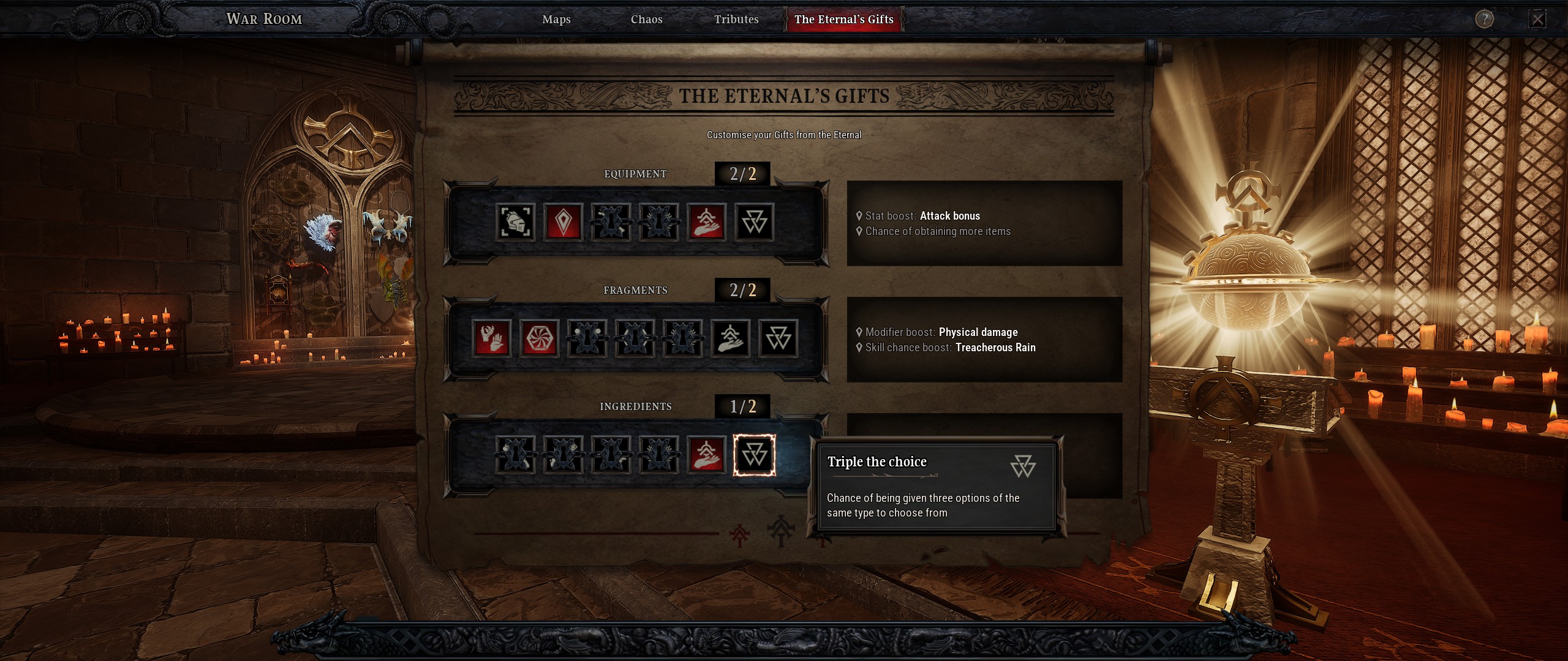 En parlant de loot, parlons des Dons de l'Éternel. Ces récompenses peuvent s'obtenir sur les boss et, en les ouvrant, on se retrouve à choisir parmi une pièce d'équipement, un fragment et un lot de matériaux (avec des propositions de qualité un peu élevée). On a également la possibilité de retirer jusqu'à deux fois une des propositions. Si ces cadeaux apparaissent dès la campagne, on débloque en endgame la possibilité de les personnaliser. On peut ainsi appliquer jusqu'à 2 modificateurs par catégorie en choisissant parmi celles débloquées. Ça permet par exemple d'augmenter les chances d'avoir un objet de qualité supérieure ou avec une stat recherchée. On peut également avoir une chance d'ouvrir un Don contenant 3 propositions de la même catégorie (par exemple trois fragments à la place d'une pièce d'équipement, un fragment et un matériaux). On peut même avoir une chance d'obtenir un objet bonus, en plus de celui choisit.